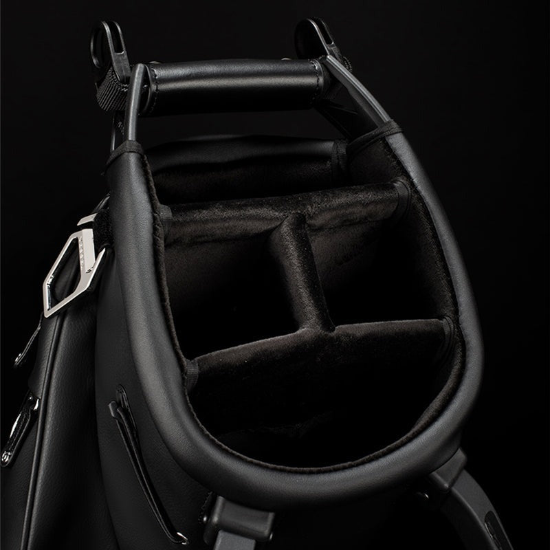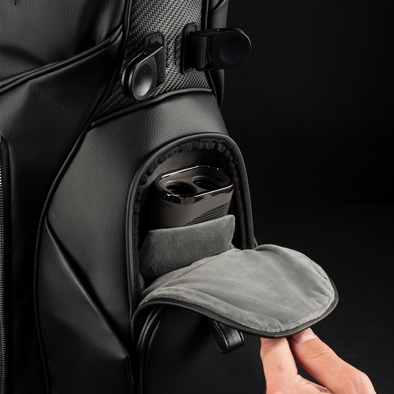 A carbon fibre-infused golf bag, the Lux Carbon has made its mark in our stand bag lineup as our most luxurious stand bag ever crafted. Unique to the Lux Carbon is its revolutionary, industry-first, carbon fiber spine which enhances the bags rigidity without compromising weight, making it the perfect choice for walking golfers seeking an elevated, lightweight carry. Genuine carbon fibre is beautifully paired with tour-grade materials, leather accents and metal zippers for a premium look and feel. The Carbon Lux features 9 external pockets including 3 quick-access magnetic pockets for added convenience on the course. Enjoy industry-leading stability and balance with our patented Rotator Base and EQ2 Double Strap. The Lux Carbon proves that you can have a lightweight bag without sacrificing functional details or luxury styling.